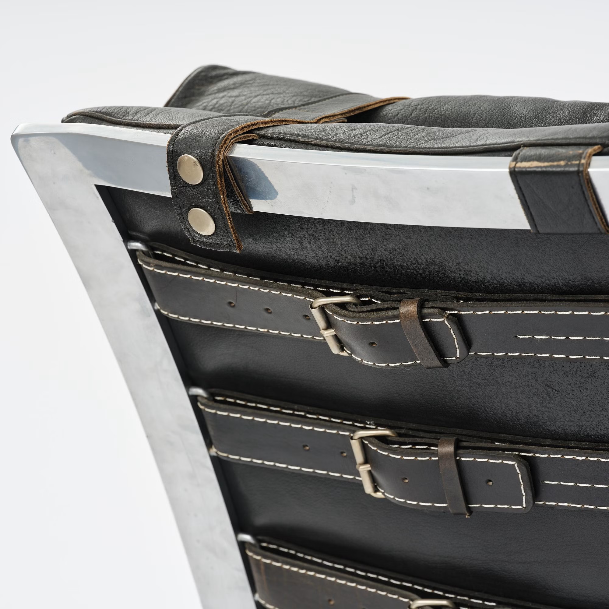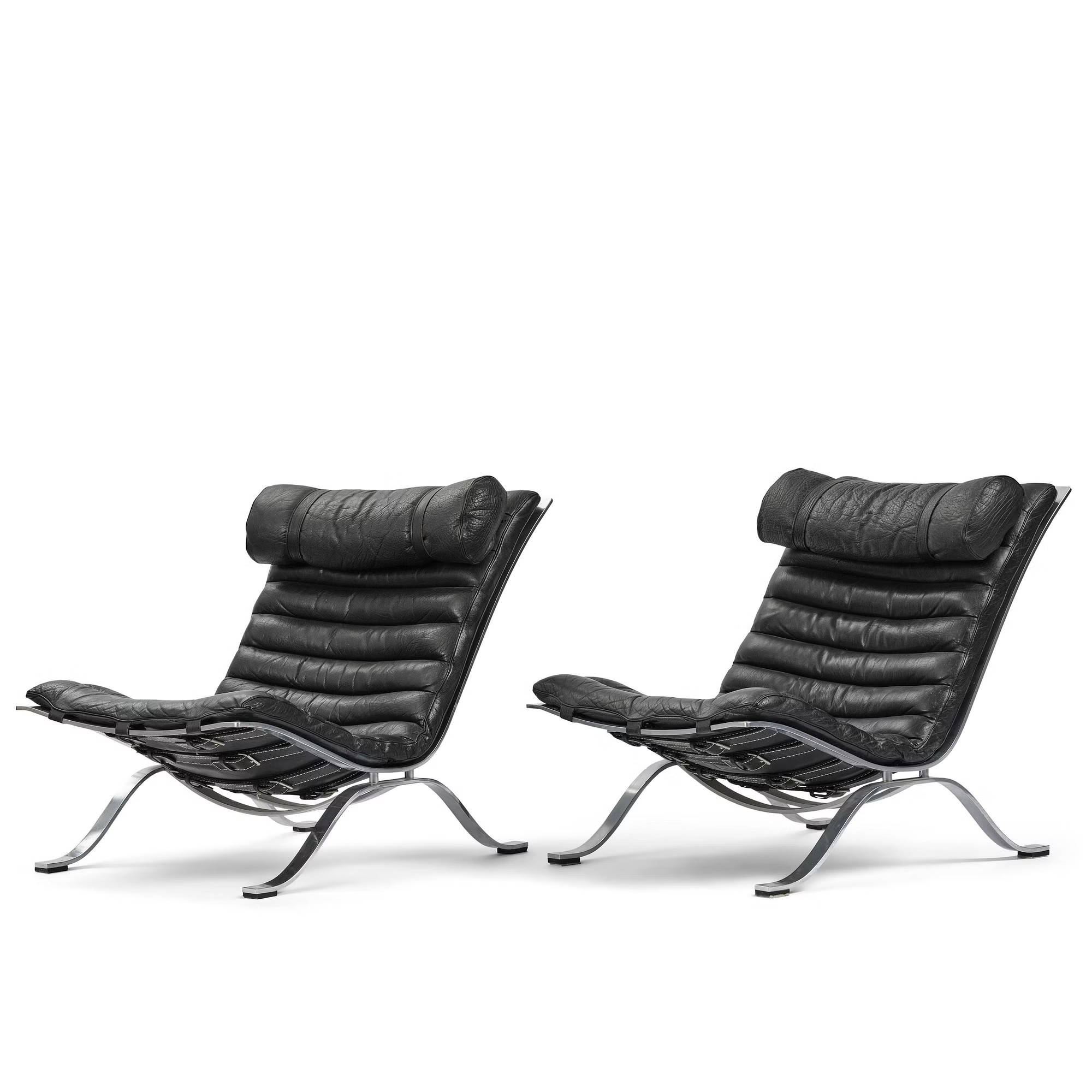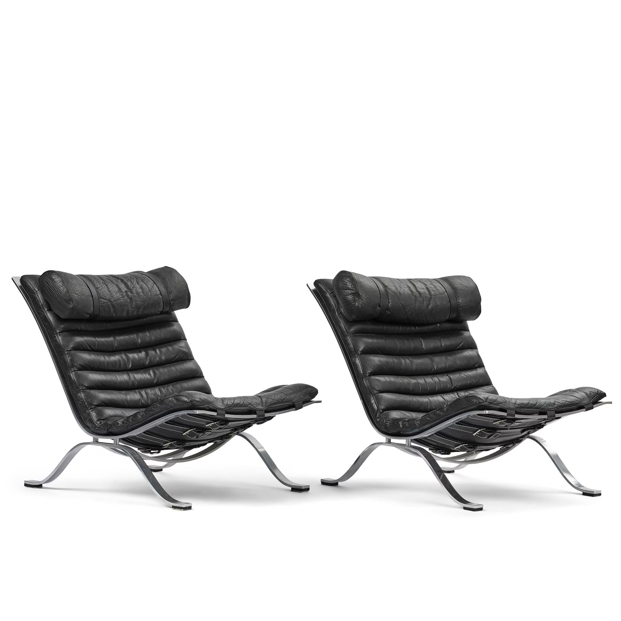 Comfortable pair of lounge chair designed by Arne Norell. This award winning lounge chair is made of high quality matt polished steel and black leather. The set is in very good condition with fantastic patina from age and usage.