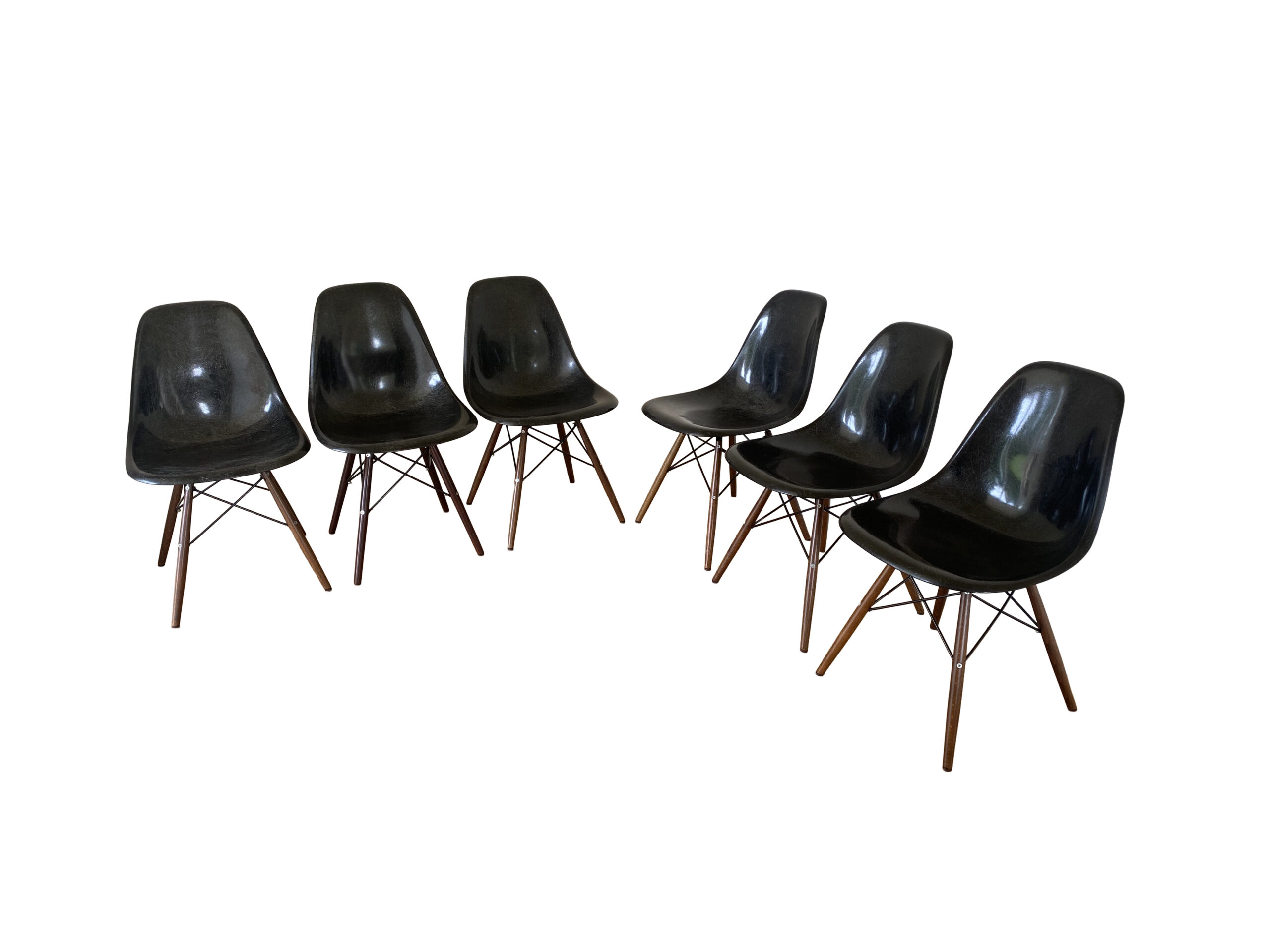 A beautiful set of six fiberglass DSW chairs designed by Charles and Ray Eames for Herman Miller. Offered in black color.