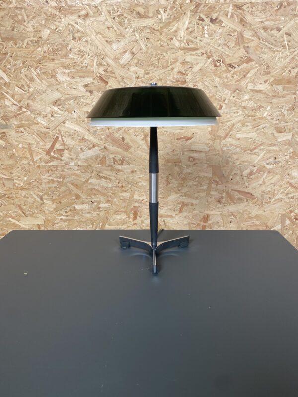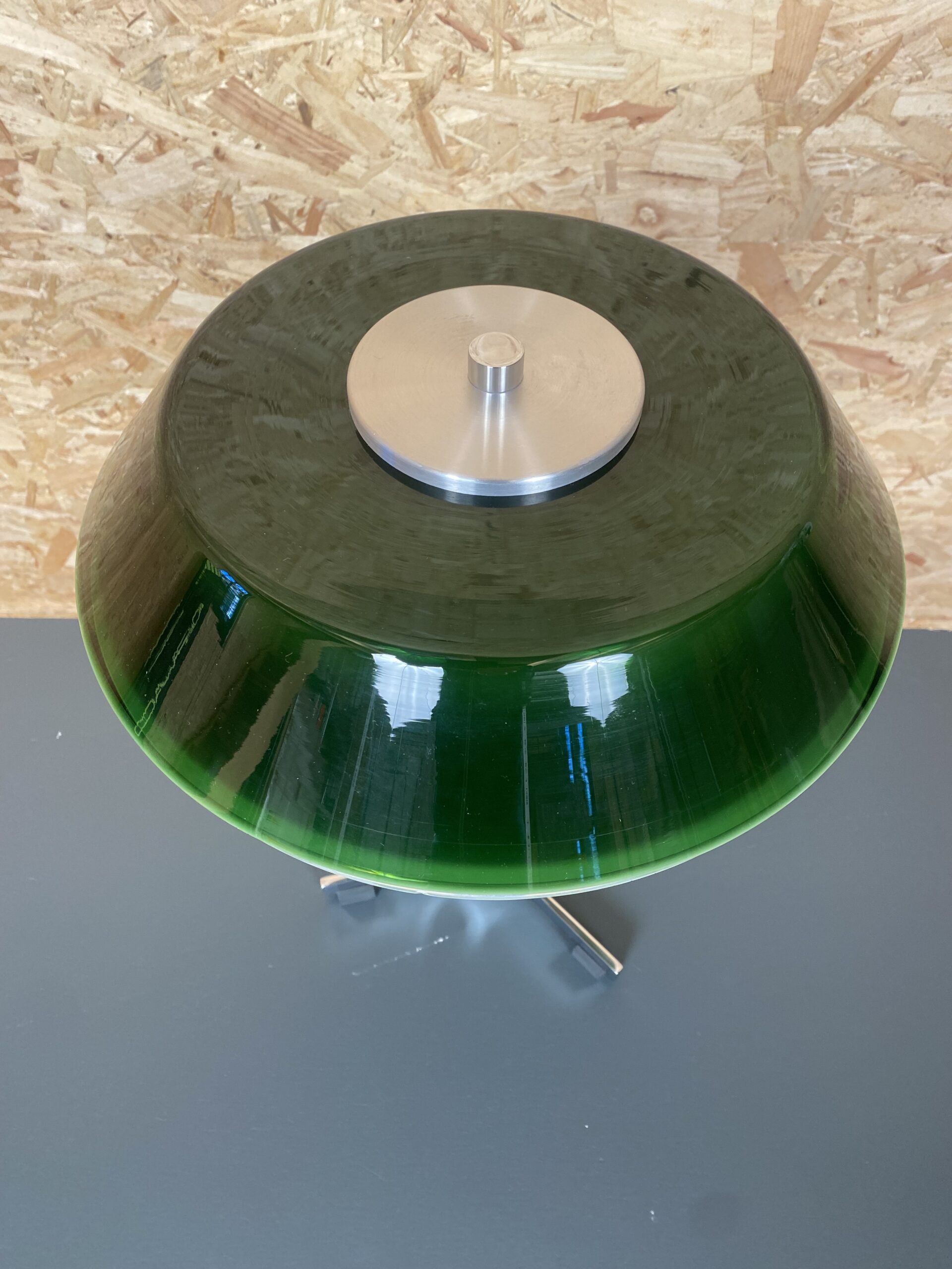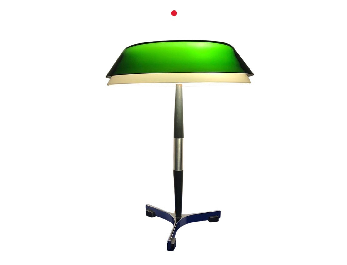 Satin aluminium, black lacquerd and chrome base, glass green lampshade exterior, opal white interior. This table lamp features two light sources.