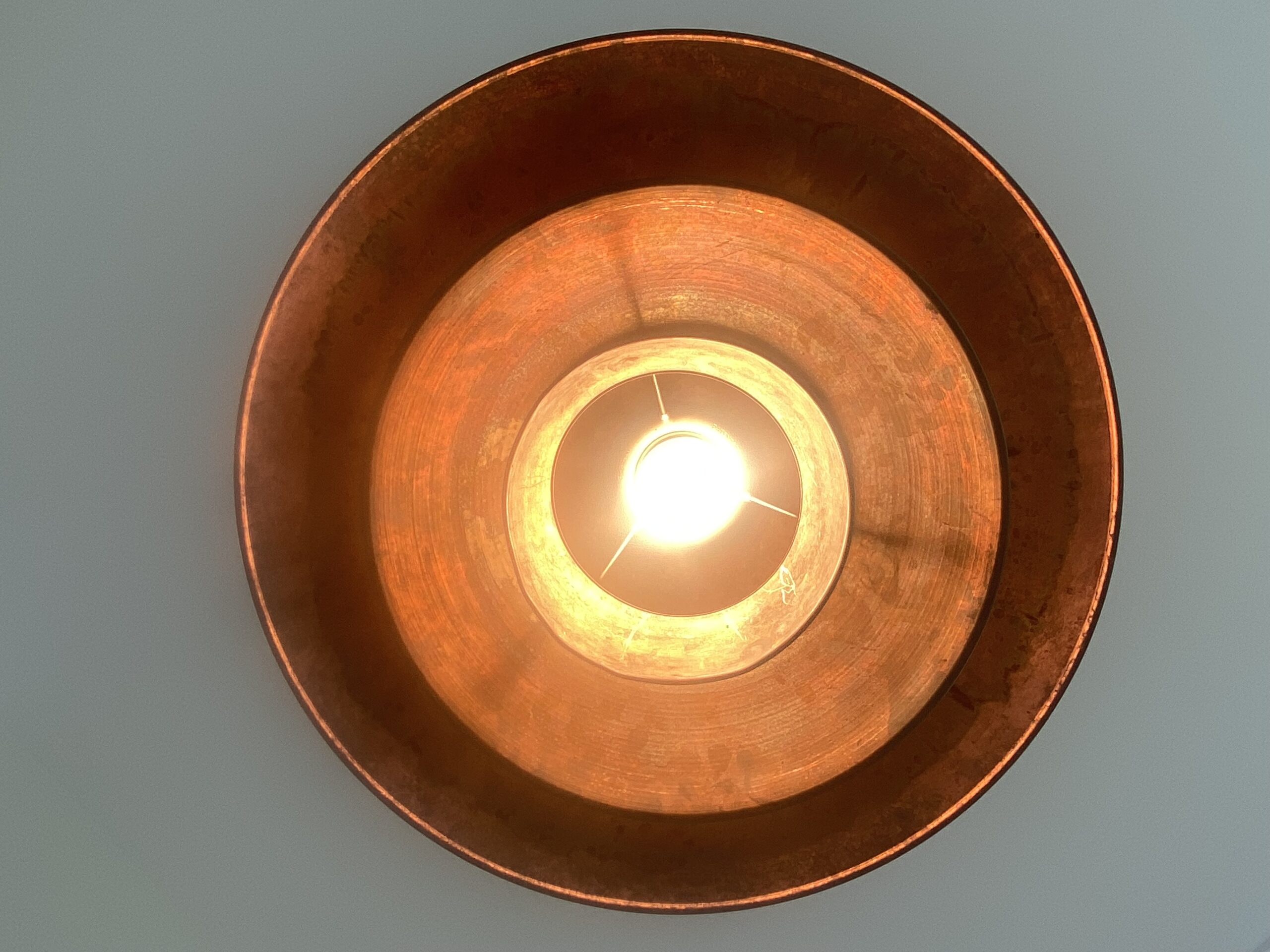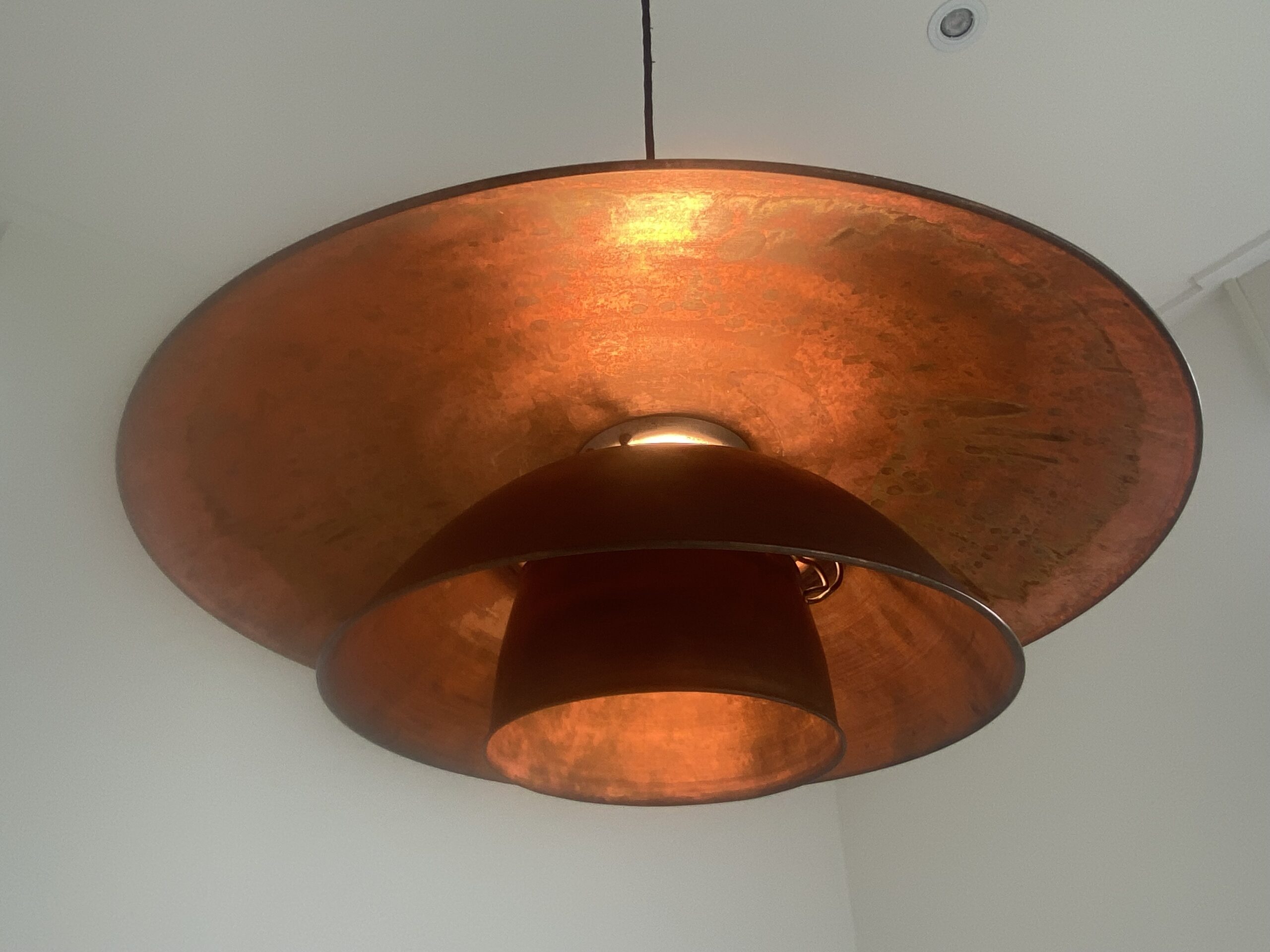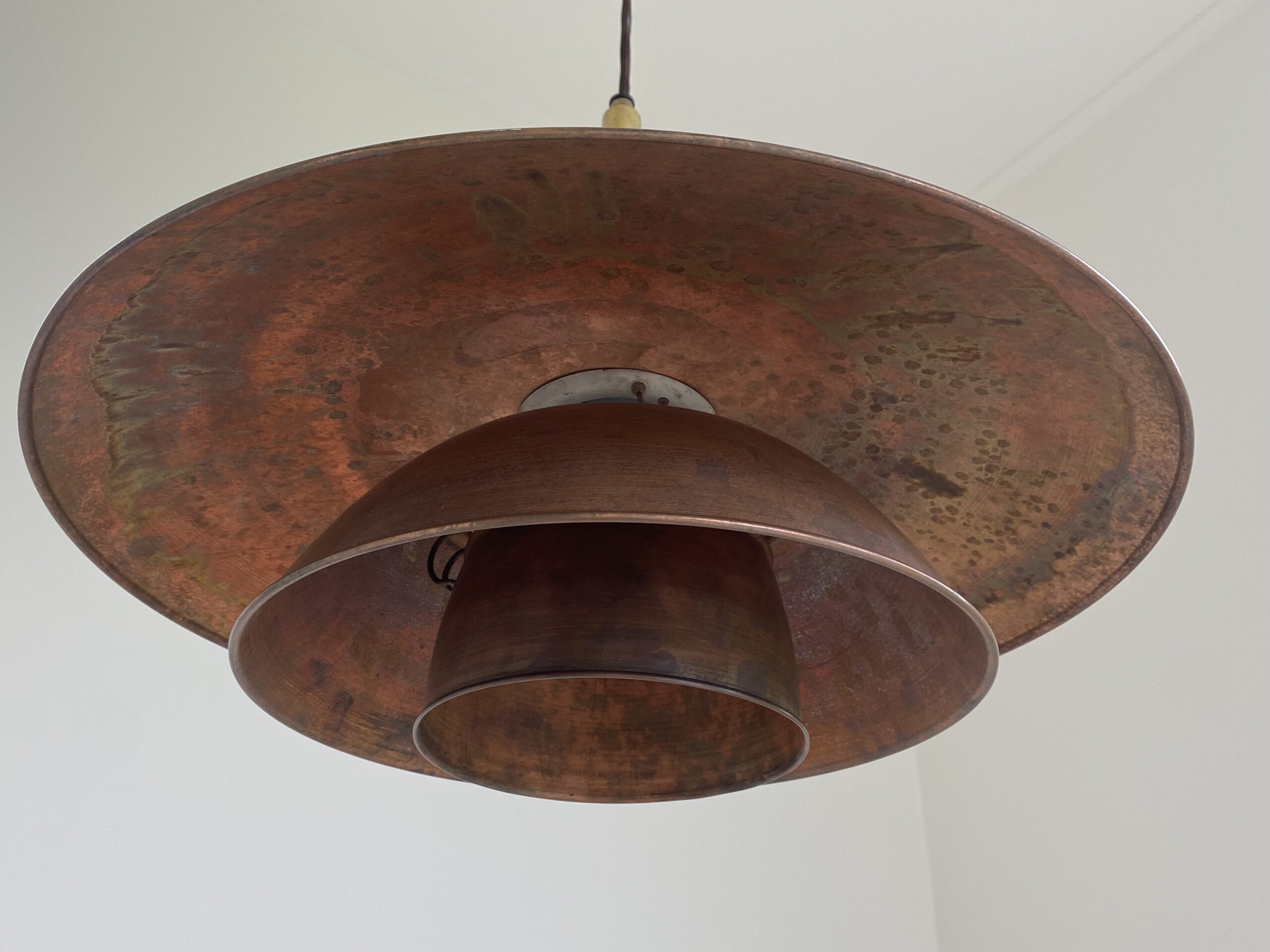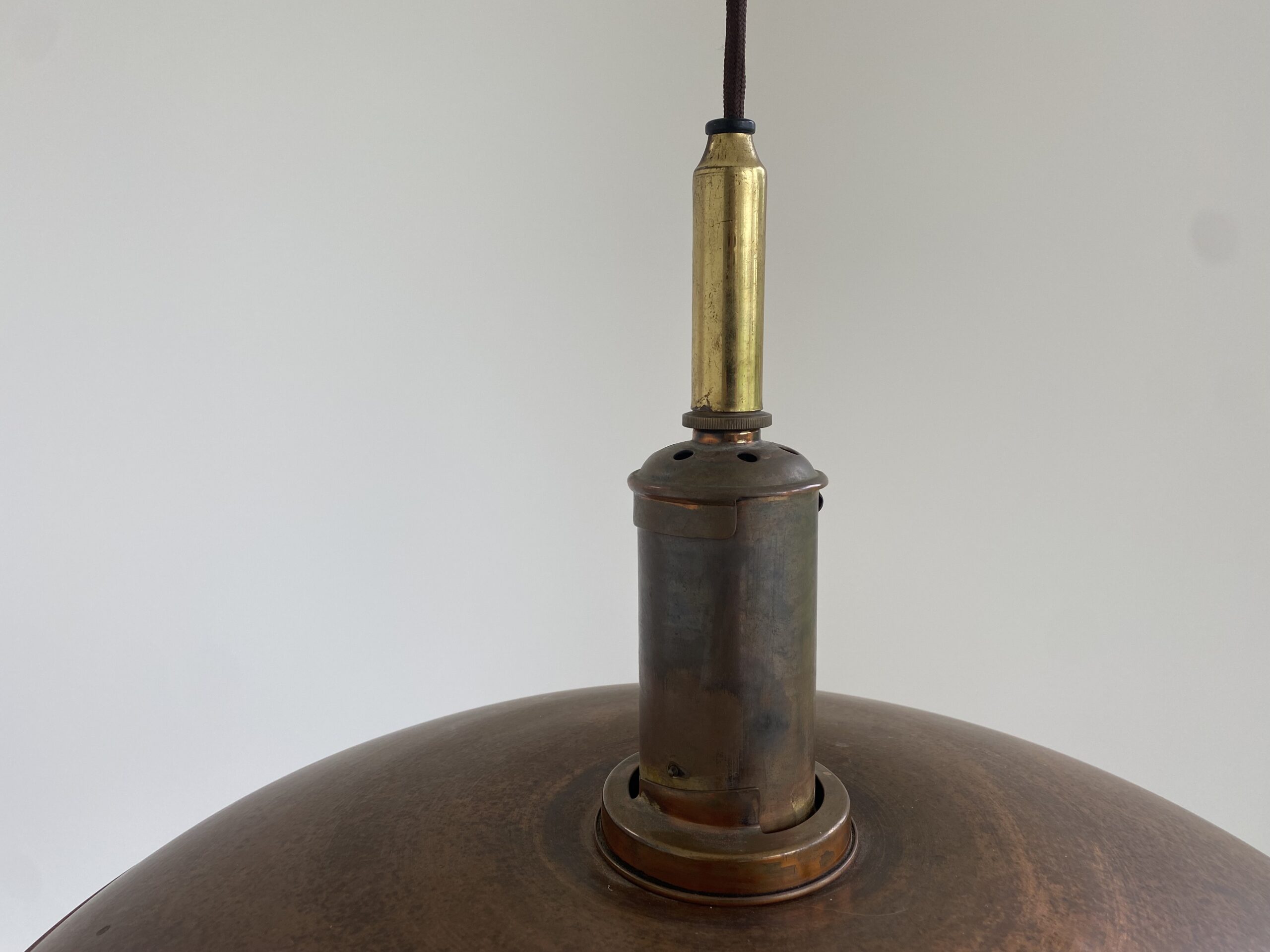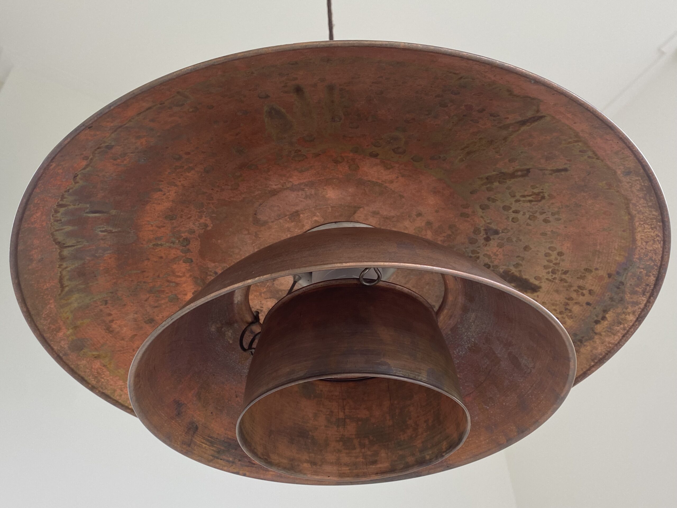 Rare and Large PH Pendant in copper and brass, designed by Poul Henningsen and manufactured by Louis Poulsen. Early model. Stamped ‘Patented’ Pendant with three shades that gives a beautiful light distribution. Good vintage condition with patina and a stunning attribution to any interior.